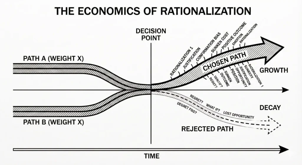 The application to buying decisions is well-documented. Researchers call it “post-decision rationalization” or “choice-supportive bias.” Once someone makes a decision – any decision – their brain immediately begins constructing the argument for why that decision was correct.
