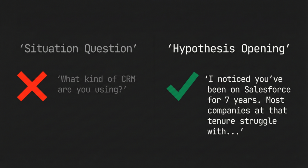 Instead of “What kind of CRM are you using?” try: “I noticed you’ve been on Salesforce for seven years. Most companies at that tenure are struggling with data latency in their custom integrations. Is that what you’re running into, or is it something else?”