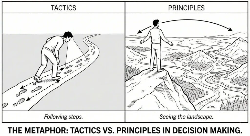 Tactics are what to do. Principles are why it works. If you understand the principles, you can generate your own tactics. If you only have tactics, you’re lost the moment the situation changes.