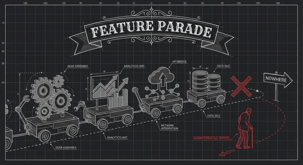 When you parade features, you’re asking the buyer to do the mental work of connecting each capability to their specific pain. Most won’t bother. They’ll nod politely and forget 90% of what you showed them within an hour.