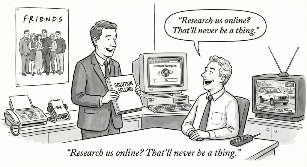 Solution Selling was built for a world where the buyer’s “research” was calling three vendors and asking for brochures.